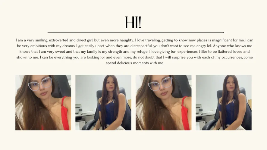 I enjoy connecting authentically, playing with glances, words, and gestures that gradually ignite curiosity. My personality is cheerful, spontaneous, and daring, always ready to surprise you and make you smile… or something more. Every moment with me is an invitation to let go, explore fantasies, and enjoy yourself without rushing.