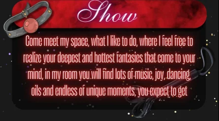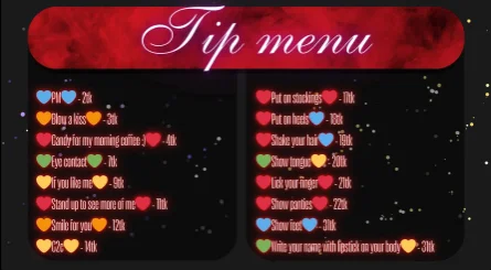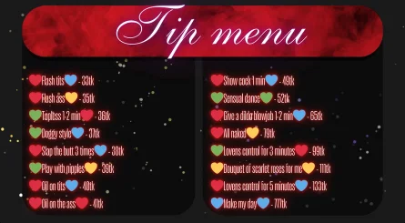 Ahegao, CEI (Instruções para comer sémen), Corpete, Canzana, Role Play, Fumar, Striptease, Brinquedos Sexuais, Twerking, Topless, Saia acima, Anal, Foda de mamas, Strapon, SPH (Humilhação para pénis pequeno), Show de óleo, Dança Erótica, Palmadas, Conversa porca, Brinquedos Anais, Ejaculação, Fingering, Exibicionismo, Fetiche por Pés, Tacões, Massagem, Nylon, Orgasmo, Masturbação, Dildo ou Vibrador, Garganta funda